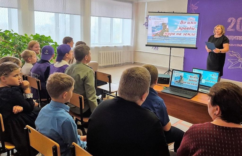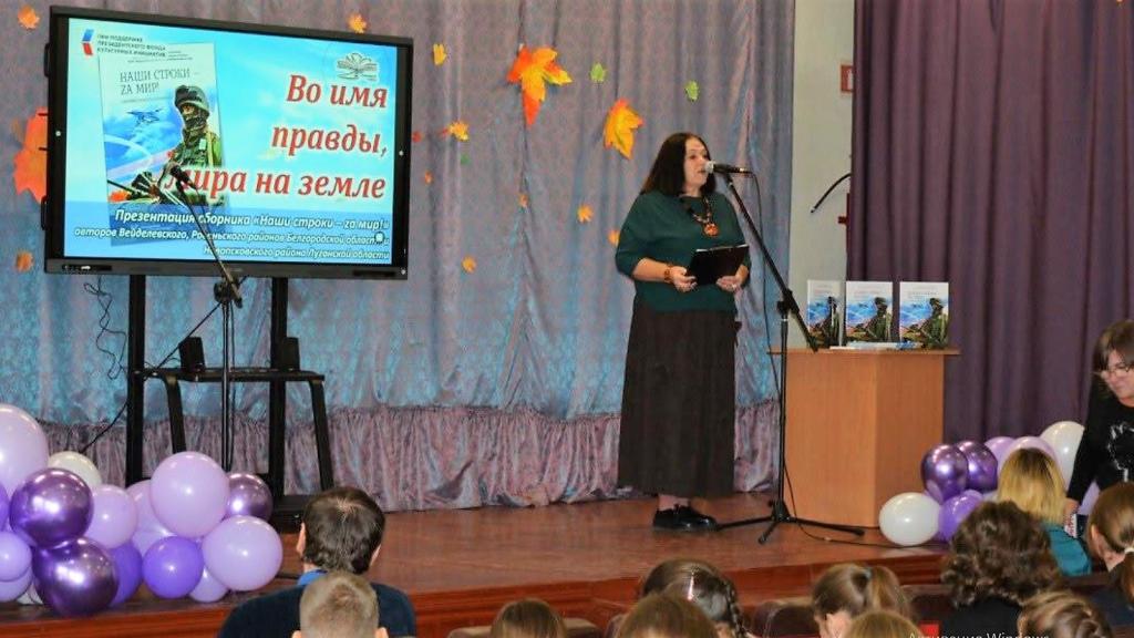 «Во имя правды, мира на земле!» – так называлась презентация сборника стихов и сочинений «Наши строки – Zа мир!», которая состоялась в первой половине октября в муниципальных библиотеках Вейделевского и Ровеньского районов Белгородчины и Новопсковском районе ЛНР. Книга издана в рамках проекта «Zа мир литературной строкой», получившего в 2025 году грантовую поддержку Президентского фонда культурных инициатив.